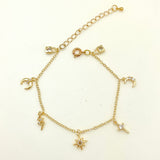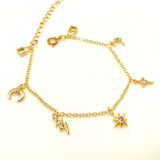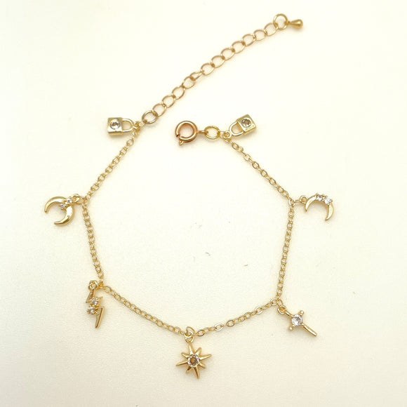 Gold plated brass and clear cubic zirconia bitty charm bracelet with six evenly spaced and adorably bitty charms including a lightening bolt, star, cross, moon, padlock and crescent, finished with a spring ring clasp and extender chain.